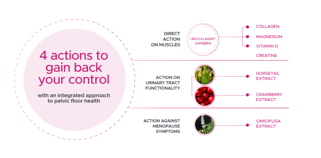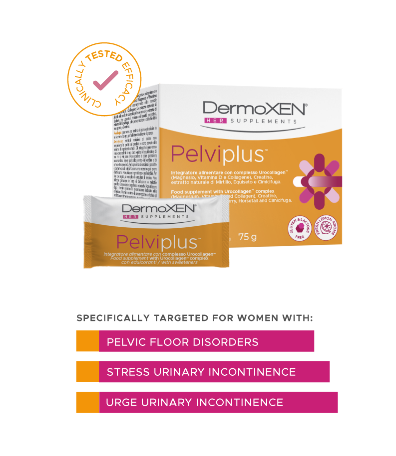 Dermoxen Pelviplus is a food supplement designed to support the maintenance of normal muscle function and urinary tract functionality in women with postpartum, stress or menopausal urinary incontinence.